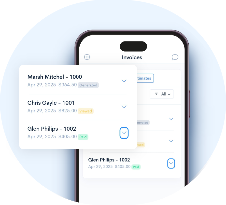 Generate sleek, branded invoices in seconds. Customize fields, add items, and send via email, text, or portal with one click.